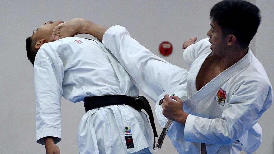 Karateka putra Indonesia Rifky Arrosyid bertarung melawan Karateka asal Vietnam Nguyen Thanh Duy di kelas 60 kg di World Trade Center Manila Filipina Minggu 8122019. 25 Juli 8 Agustus 2021. Untuk cabor baseball di Olimpiade Tokyo 2021 nantinya akan diikuti.