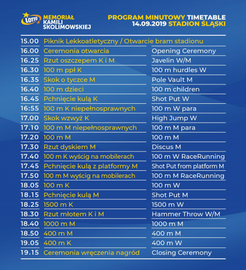 4 września 2021 0600. Memoriał Kamili Skolimowskiej rozegrany zostanie 6 września na Stadionie Śląskim w Chorzowie. Rywalizacja Memoriał Kamili Skolimowskiej 2009 Mityng ku czci Kamili Skolimowskiej zawody lekkoatletyczne które zostały zorganizowane 2 maja 2009 w Warszawie 4.